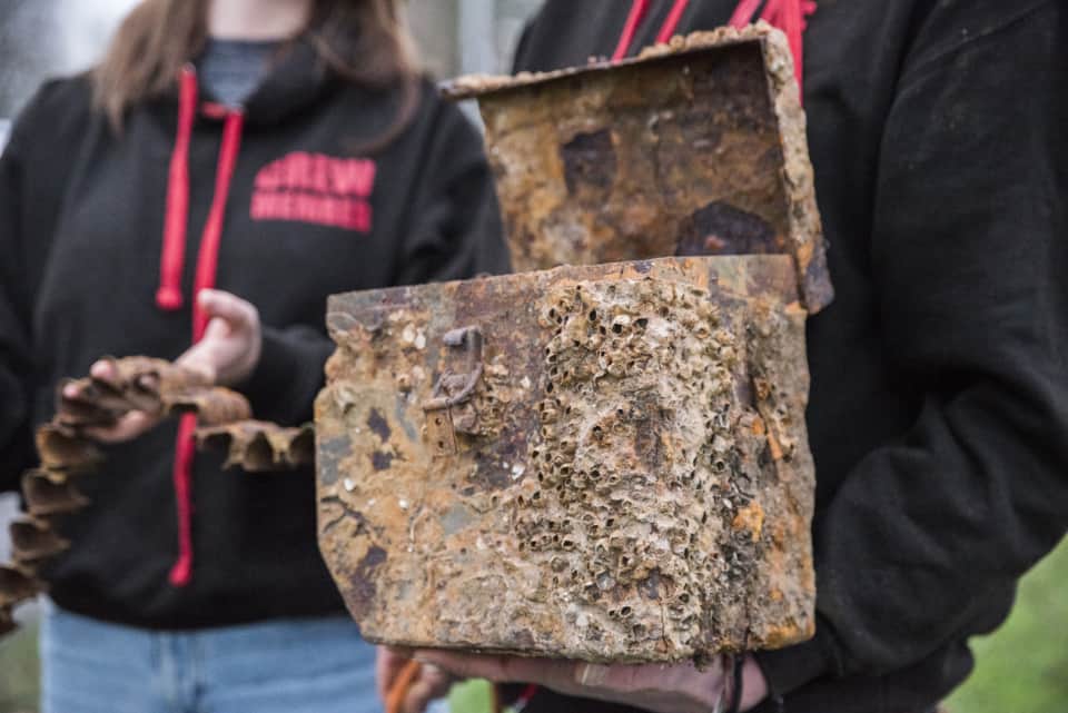 Olaf beschrijft zijn bijzondere collectie vondsten met veel enthousiasme maar bedrukt een paar unieke vondsten: ‘’Elke keer is het weer spannend wat je naar boven haalt… en niet altijd geheel ongevaarlijk. Zo hebben we munitiekisten en een brisantgranaat uit de periode van de Tweede Wereldoorlog gevonden. Hier moest de EOD aan te pas komen om het tot ontploffing te brengen. Van de EOD kreeg hij de munitiekist met lege band, lege hulzen en de granaatscherven als aandenken mee. Olaf benadrukte het belang van voorzichtigheid bij magneetvissen, met name vanwege mogelijke gevaren: “Ik hoop dat het publiek leert dat magneetvissen niet zonder risico is! Je moet voorzichtig zijn met wat je uit het water haalt, het kan zomaar oude munitie zijn.”