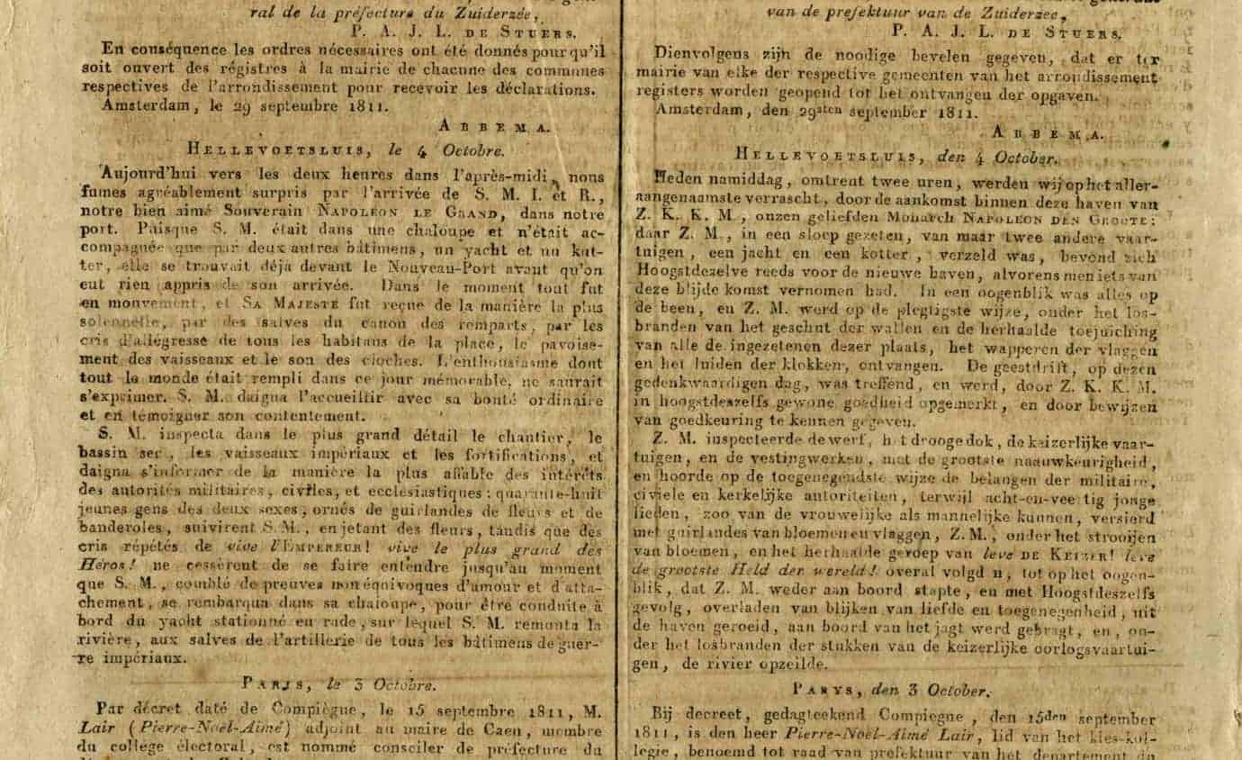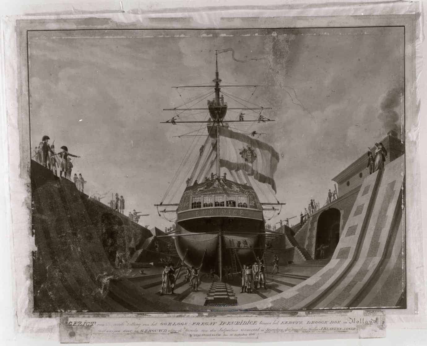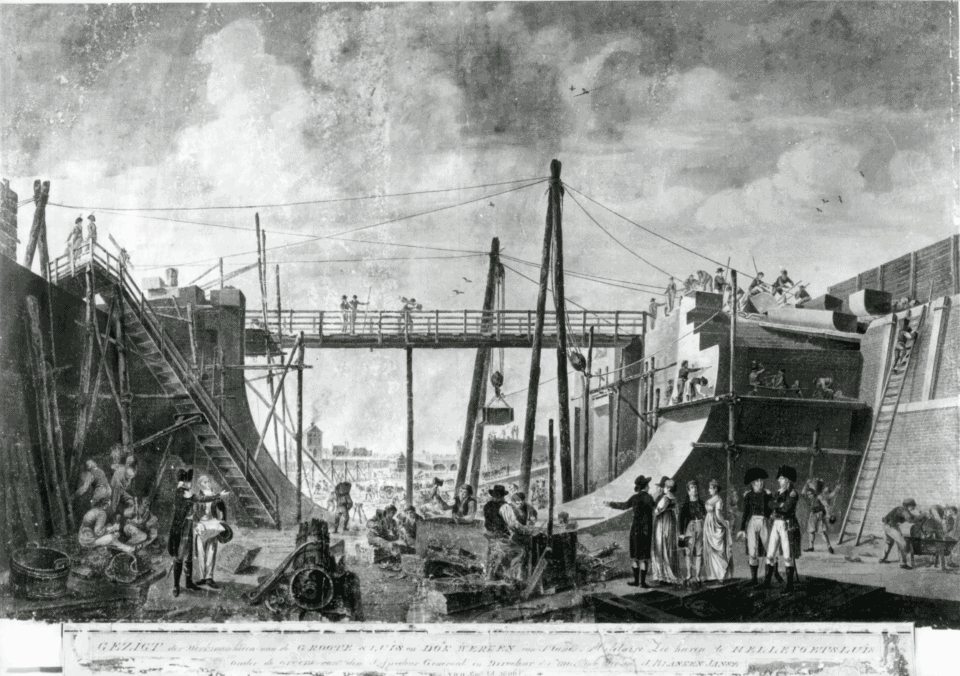 Aan het einde van de achttiende eeuw wordt Nederland veroverd door de Fransen. Eerst als Bataafse Republiek, later als onderdeel van het Franse Rijk. Tijdens de Franse tijd ondergaat de haven onder leiding van Jan Blanken nieuwe verbouwingen. Deze afbeelding toont de vele werkzaamheden, zoals onder meer de bouw van het Droogdok. In 1811 brengt Napoleon een kort bezoek aan Hellevoetsluis om de vernieuwde haven te inspecteren. Na het vertrek van de Fransen in 1813 beschikt Hellevoetsluis officieel over een moderne haven.