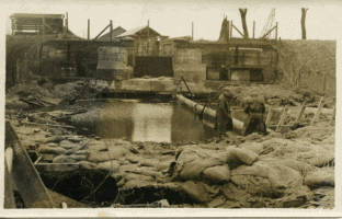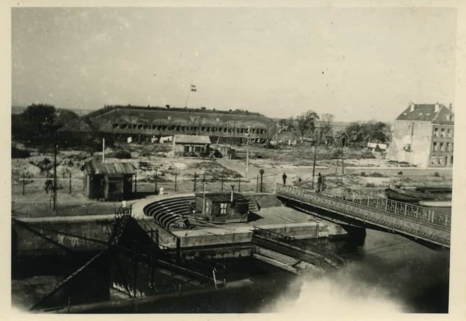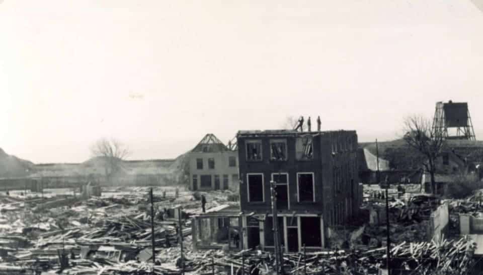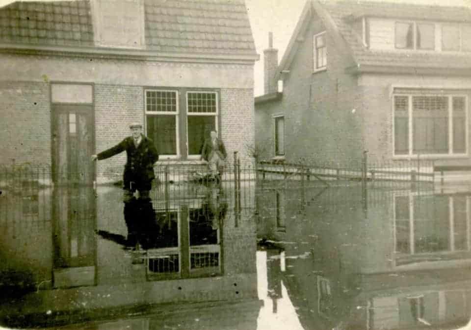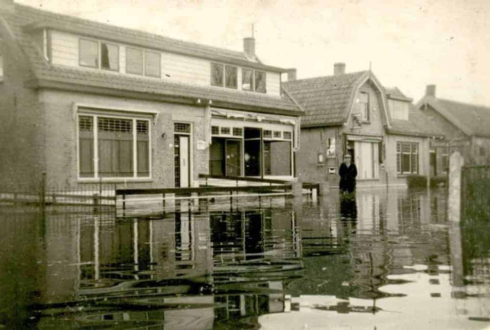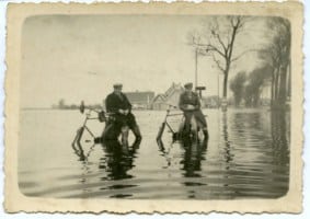 Op de volgende foto’s zie je straten vol met water. Het normale leven wordt tijdelijk helemaal stilgezet. Zo staan Cor Briggeman en Jan Lesuis met hun fiets in het water tijdens de inundatie. De meest ingrijpende gebeurtenis tijdens de bezettingsjaren is de sloop van vrijwel alle bebouwing langs de westzijde van de haven. De bezetters willen zo een ruim schootsveld creëren, zodat de haven voor een geallieerde landing kan worden behoed.