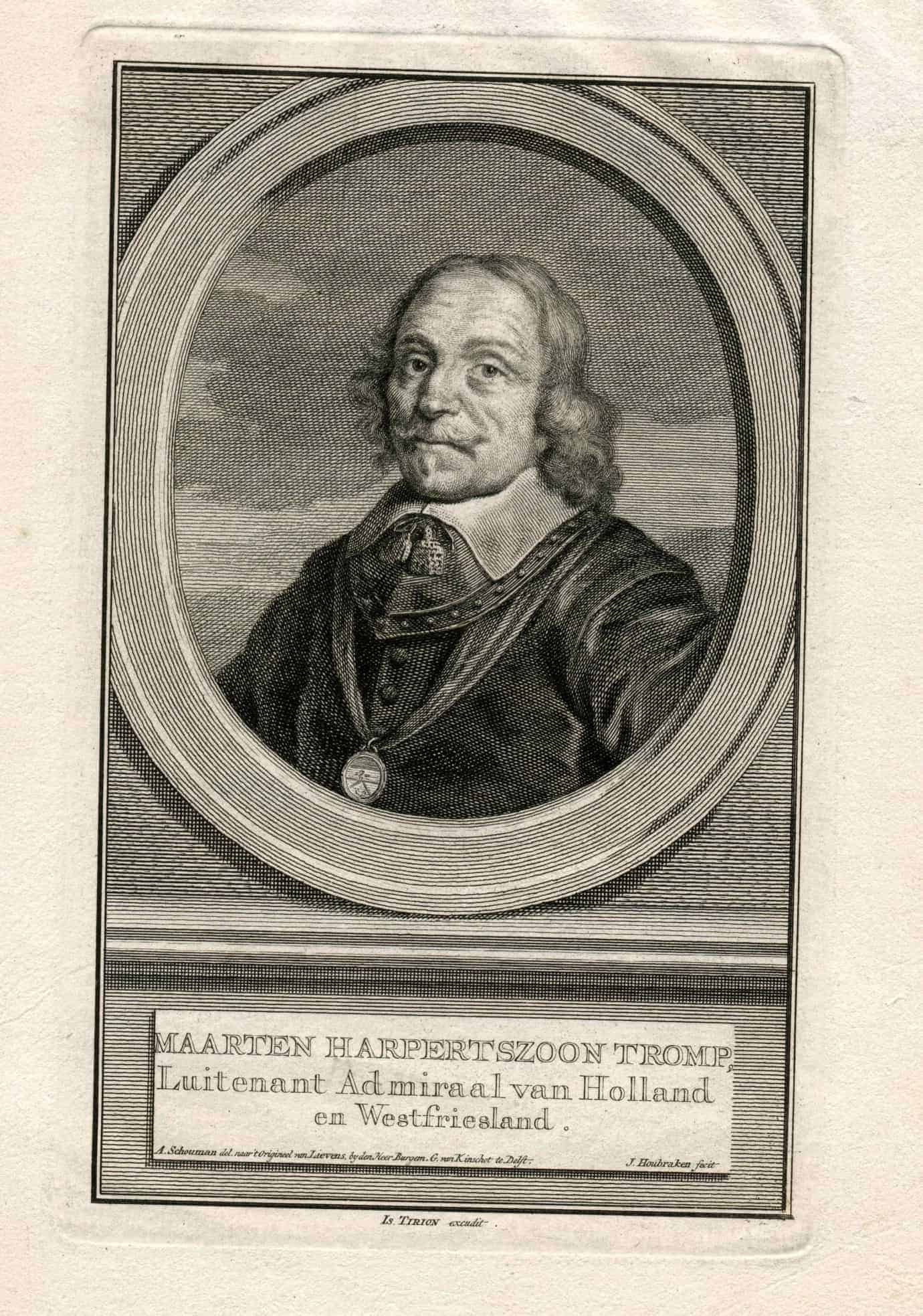 Op het portret draagt hij een halsberg en een medaille met zijn wapen aan een lint. Dit is in het zilver een rode keper, vergezeld van een oorlogsschip en een blauw schildhoofd met daarin een gouden lelie. In de Nederlandse geschiedenis wordt Tromp gezien als zeeheld. Door zijn succesvolle dienst in de koopvaart en marine tijdens een periode van internationale spanning en toenemende wereldhandel.
