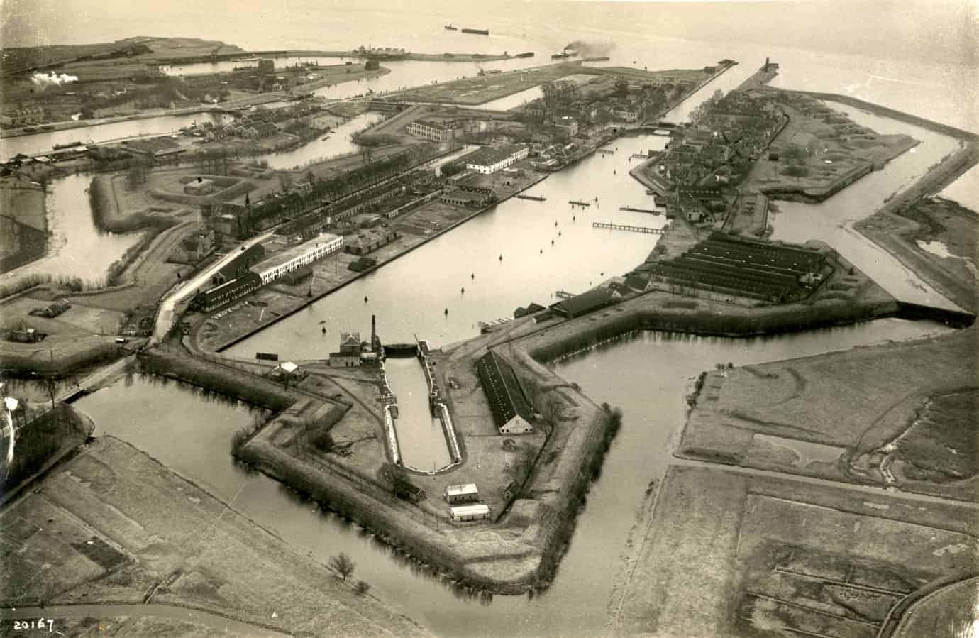 De foto laat de vesting van Hellevoetsluis en haar haven in 1922 zien. De haven ligt er stil en verlaten bij.