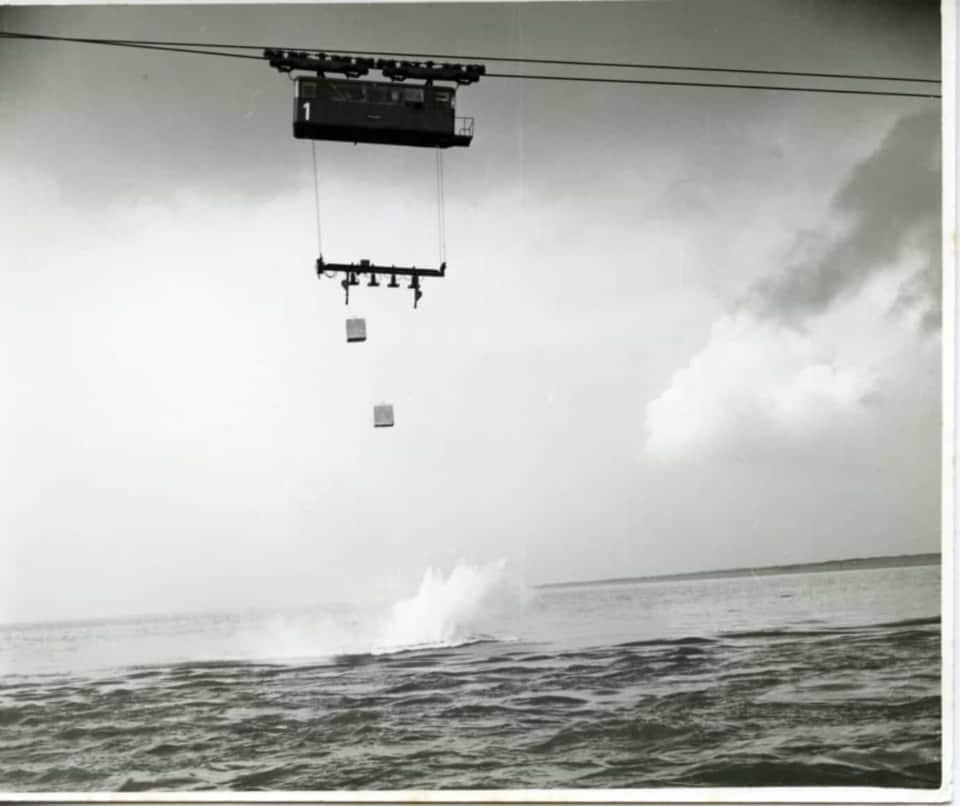 Zoals je op de foto kunt zien, worden deze blokken vanuit een gondel die aan een kabelbaan hangt in zee geworpen. In totaal worden 140.000 van dit soort blokken vervaardigd en in de watergangen tussen de oevers en de sluizen gegooid. De blokkendam vormt een stevige ondergrond voor het dijklichaam dat met opgespoten zand, grond en asfalt verder wordt opgehoogd.