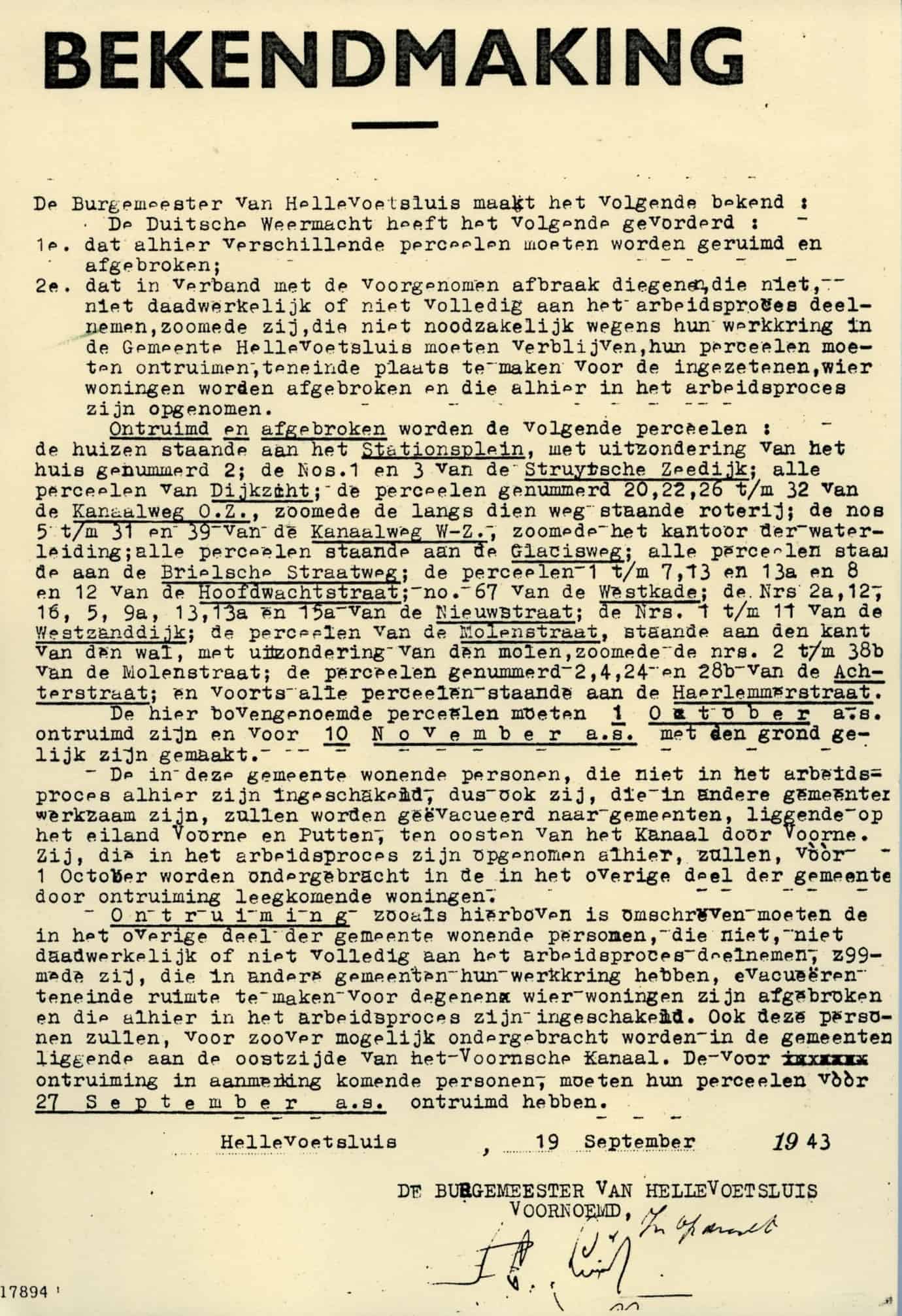 L. van der Knoop meldde het in zijn dagboek op 19 september 1943: “Van de plm. 1300 bewoners van Hellevoetsluis schijnen er 650 te moeten evacueren. Een groot gedeelte van Hellevoetsluis, waaronder meest de nieuwste woningen, schijnen om redenen van strategische aard te worden afgebroken.’’ En op 3 maart 1944 schrijft hij: “Hellevoet is thans zowat afgebroken.’’ Het is treurig om te zien hoe elke dag een stukje van het westelijk deel van de vesting wordt gesloopt. Tegen het einde van de oorlog telt Hellevoetsluis amper 700 inwoners.