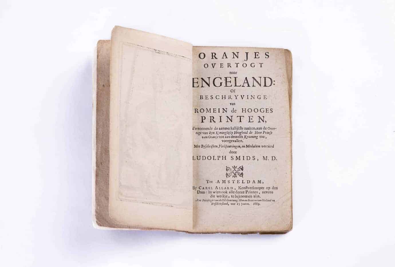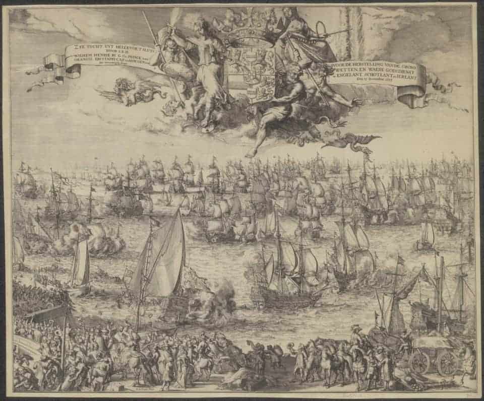 Deze prent laat de enorme vloot van Willem III en Maria Stuart zien, liggend in de haven van Hellevoetsluis. Na zijn aankomst in Torbay wordt Willem III koel ontvangen door het Engelse volk, maar na een paar dagen heeft zijn opmars naar Londen toch veel weg van een triomftocht. Het Engelse leger sluit zich deels bij Willems troepen aan. Op 2 januari 1689 vlucht koning Jacobus naar Frankrijk, zodat de Engelse troon vrijkomt. De kroon wordt aan Willem en Maria aangeboden, zoals de Engelse protestantse Lagerhuisleden voor ogen hadden. De troonovername van Willem III, ook wel bekend als de ‘Glorious Revolution’, betekent een ommekeer in Engeland op religieus, staatkundig en maatschappelijk gebied.