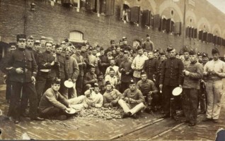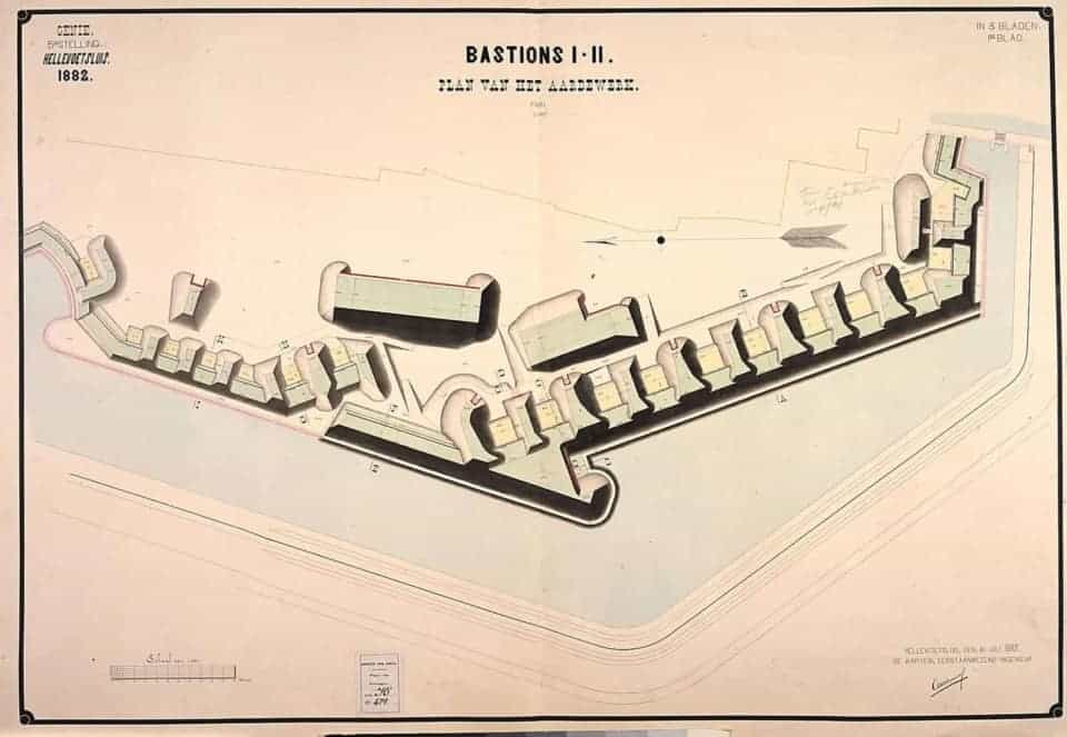 Op de foto zie je de ‘bomvrije’ Kazerne Haerlem met haar manschappen. Voor het inkwartieren van de honderden soldaten die in tijd van mobilisatie en oorlog de vesting bevolken, wordt de Bomvrije Kazerne Haerlem gebouwd. In de kazerne is ruimte voor maar liefst 350 manschappen en officieren.