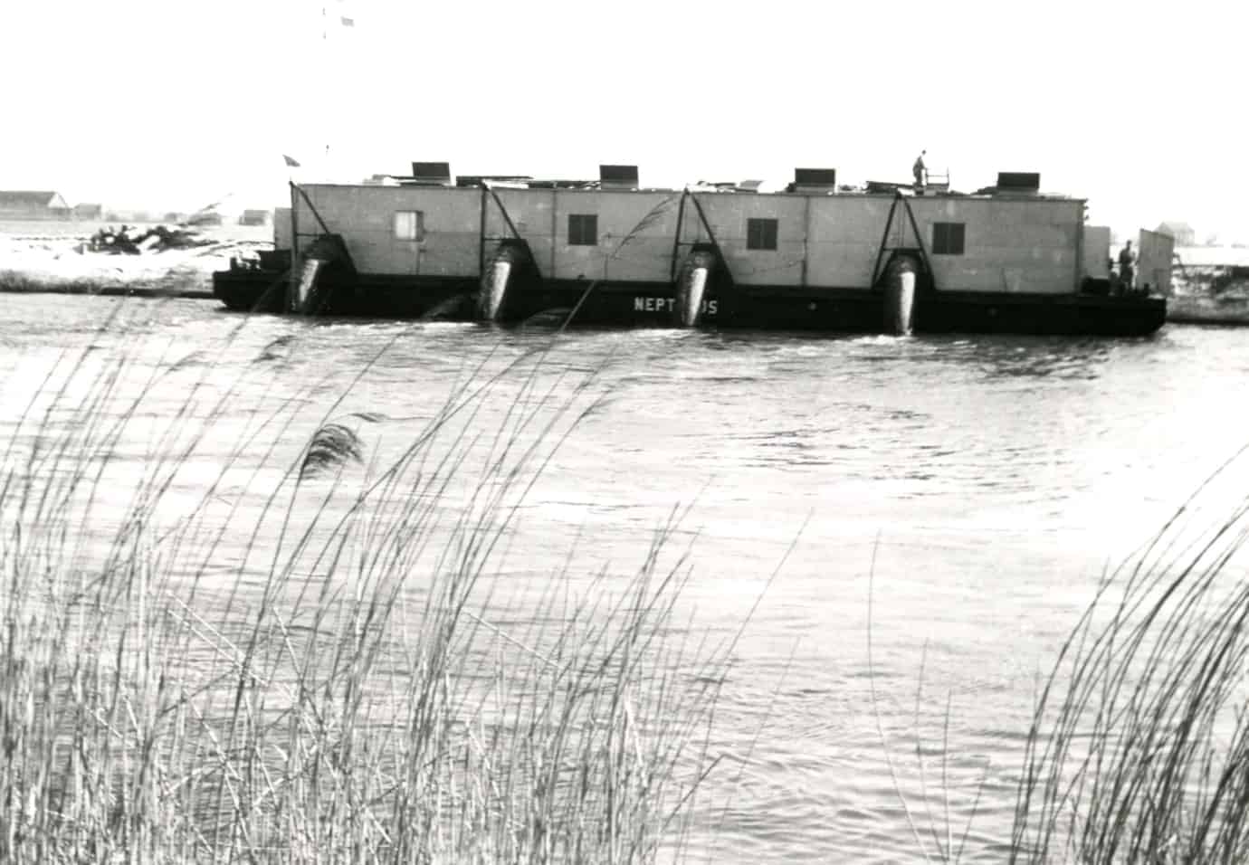 Een gemaal is een inrichting om water van een lager naar een hoger niveau te brengen. Het brengt of houdt water in een peilgebied op een bepaald peil. Het noodgemaal Neptunus uit ‘s-Gravendeel wordt tijdens de watersnoodramp ingezet om water het Kanaal door Voorne in te pompen om het land weer droog te krijgen. Deze foto van noodgemaal Neptunus is genomen door D. van Delden.