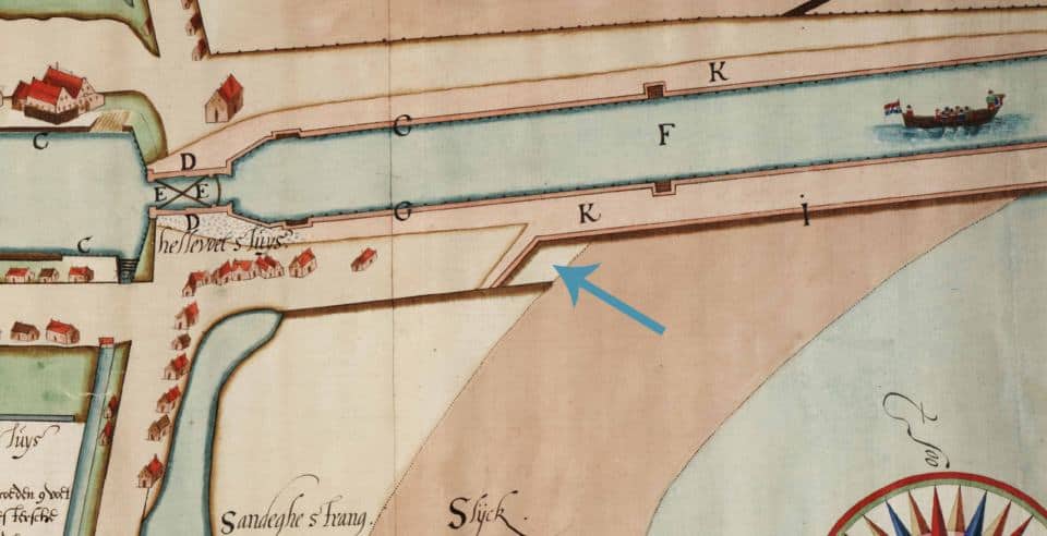 In 1576 neemt Jan Janszoon Potter de opdracht aan om een kaart te maken van ’de heerlijkheid Voorne’: de eilanden Voorne, Goeree en Overflakkee. Op deze kaart schetst hij hoe de Maas uitkomt in de Noordzee. Op de kaart van Potter is de afwateringsgeul te zien die loopt vanuit de polder Nieuw-Hellevoet, via een sluis door de polder ’t Weergors, naar het Haringvliet. Achter de ‘Hellevoetsche Sluis’ ontstaat een natuurlijke geul in de gorzen, die sinds 1395 is uitgesleten door de schurende werking van het polderwater.