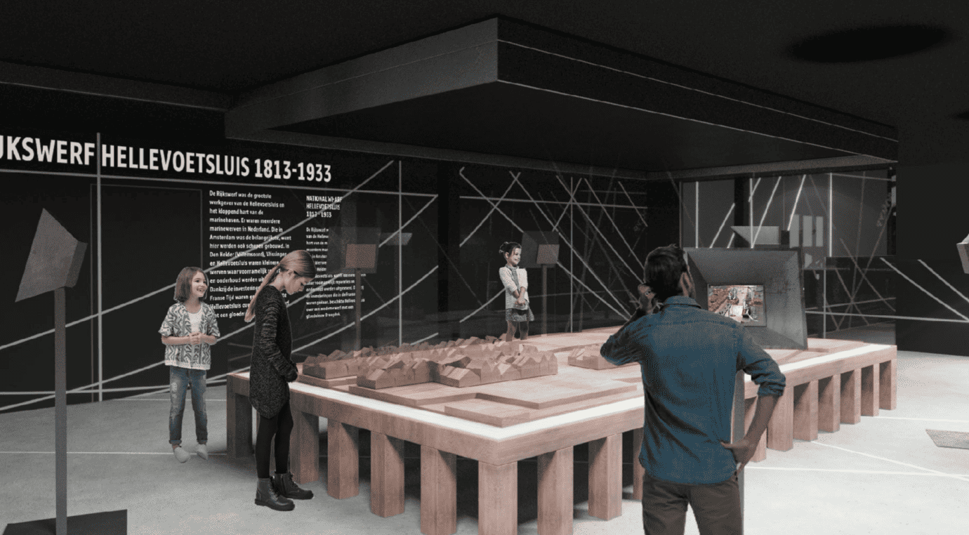 De grote stadsmaquette vormt een bijzonder object van waaruit de bezoeker met gebruikmaking van AR en VR zelf een rol pakt in het leven van Hellevoetsluis. Deze maquette van groot formaat is het meest belangrijke object in het museum. Het is aansprekend en laagdrempelig. De bezoeker weet direct waar hij/zij zich bevindt en ziet alles voor zich waarover hij/zij meer te weten gaat komen in het museum. De maquette werd in 1888 gemaakt door een getalenteerde ambachtsman van de Rijkswerf en behoort tot nu tot de collectie van het Rijksmuseum. Deze unieke maquette wordt in langdurige bruikleen afgestaan, mits voldaan kan worden aan de conserverende voorwaarden van het Rijksmuseum. Met de inzet van AR komt de maquette tot leven. Bewegende scènes tonen historische taferelen: oefeningen en exercities van de marine op de kade, het lossen van schepen en het schutten van de zeesluis, het binnenvaren en aanleggen. De bezoeker stapt als het ware in een tijdmachine. Elk scherm is gericht op een andere plek en toont andere gebeurtenissen. Met behulp van beschikbare tablets worden op verschillende plaatsen personen getoond in hun dagelijkse bezigheden op de werf. De verschillende beroepen, maar ook de relatie met de stad wordt verder uitgelegd. De maquette, die toentertijd gemaakt werden om overzicht en inzicht te geven, hebben tegenwoordig dezelfde functie. Anno nu word de maquette geactualiseerd met toevoeging van innovatieve belevingstechniek.